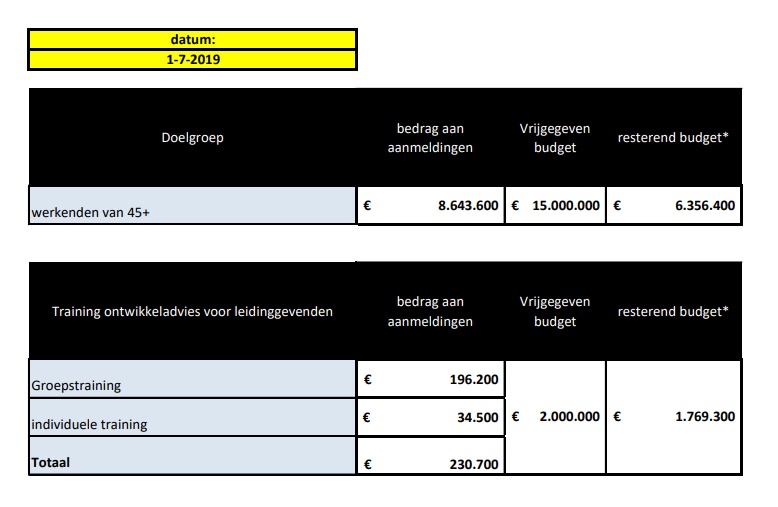Op 1 juli 2019 is er nog een resterend budget beschikbaar van € 6.356.400. Zoals in de regeling is bepaald vervalt daarmee de reservering voor specifieke beroepsgroepen. Per 1 juli 2019 is het resterende budget dan ook beschikbaar voor alle werkende 45-plussers.